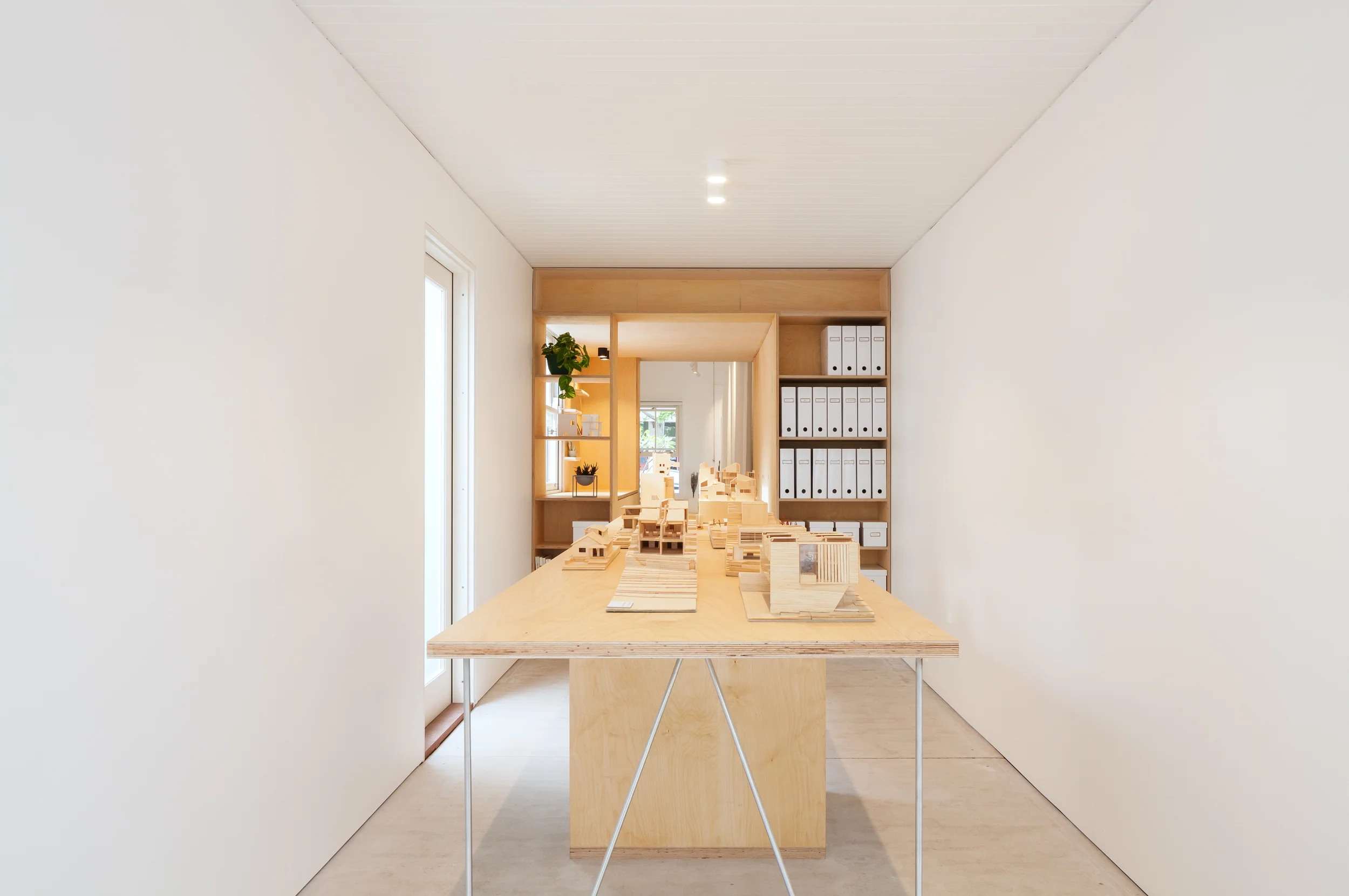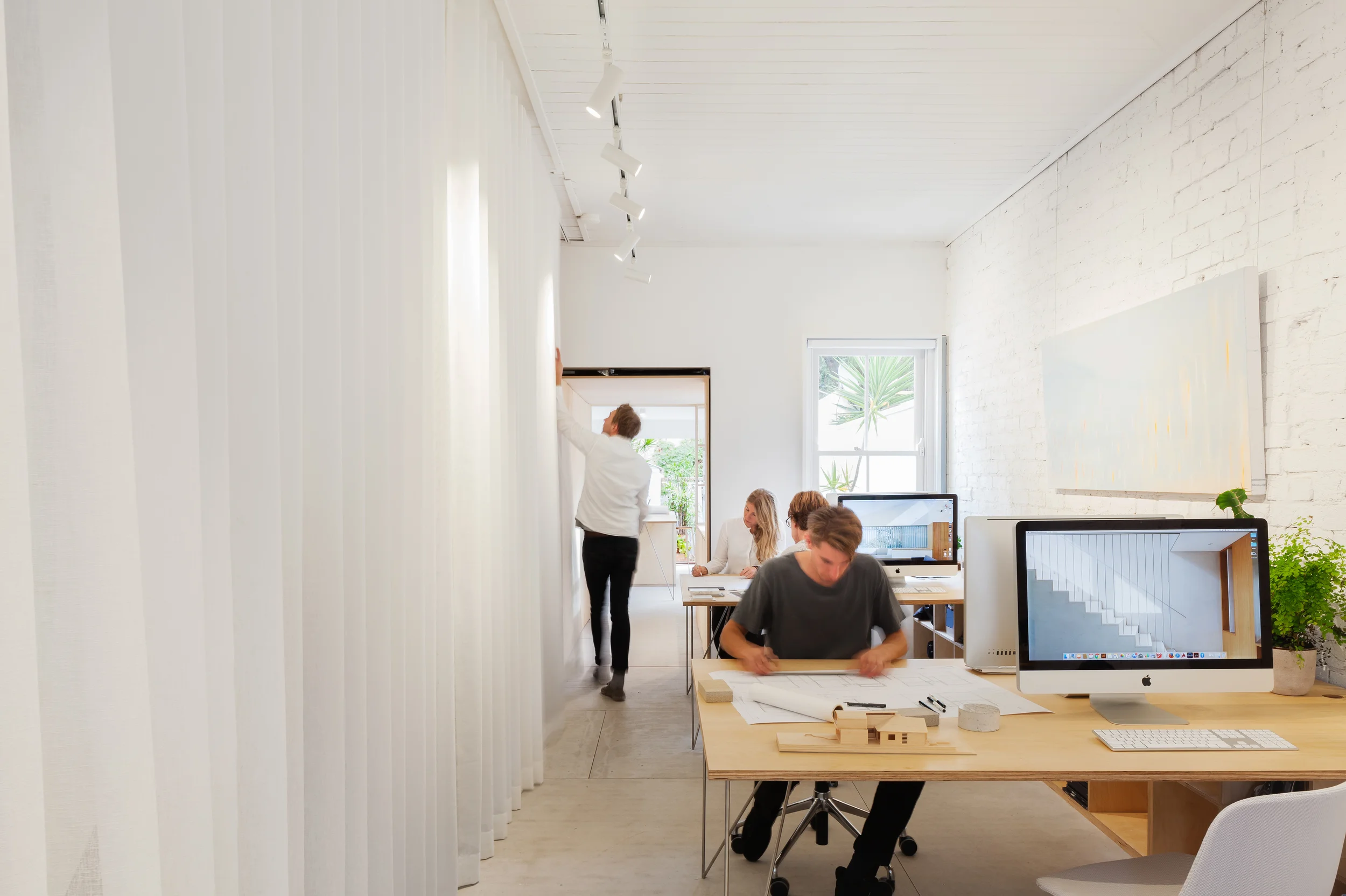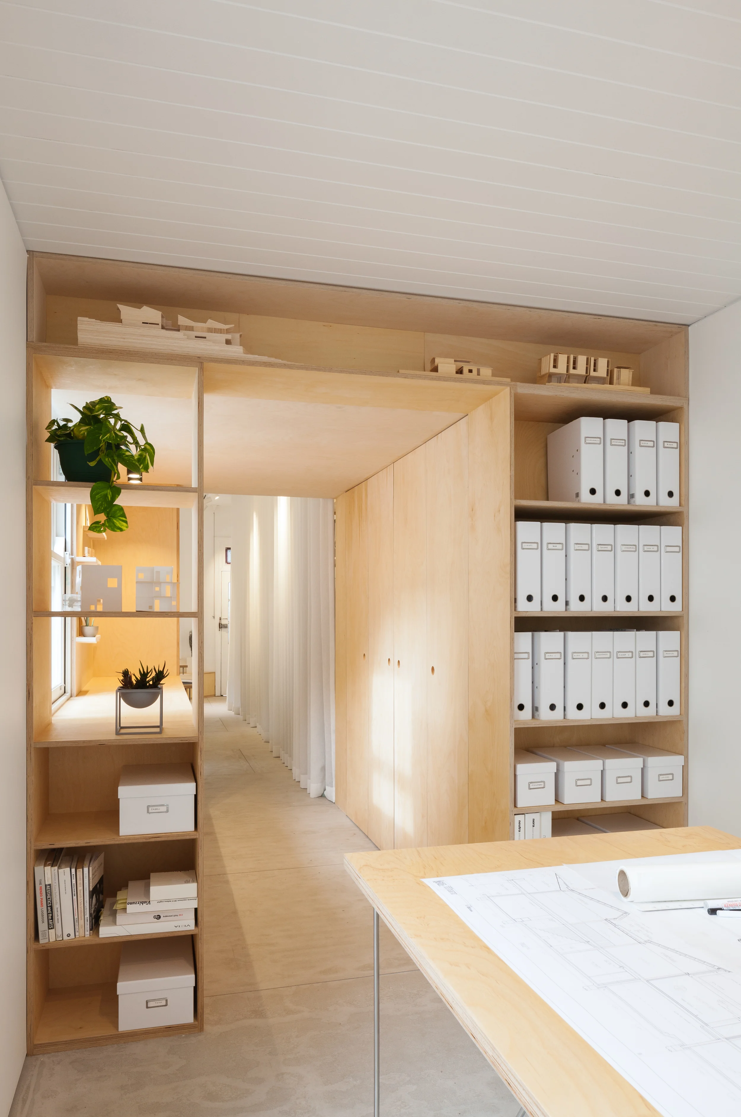 Studio 45 is Marston Architects’ work space in Manly. A thoughtful renovation and transformation of a heritage-listed terrace house, care was taken to restore the original features of the external facade. Internally, the space has been divided into two distinct zones, separated by a plywood utility box housing a concealed kitchen and associated storage space. The eastern zone contains four individual workstations, projecting from an open plywood storage unit running along the full length of the northern wall. Fine, stainless steel rod legs allow the desks to seemingly float above the floor, minimising visual impact. A 3-metre high white linen curtain runs along the entire southern wall, concealing storage and the access to the first floor. The western zone is designed for collaboration, with a high workbench used for model-making, painting, drawing, and meetings. The custom-made ply joinery and compressed sheet flooring run through the entire workspace, tying the parts together into an integrated whole.